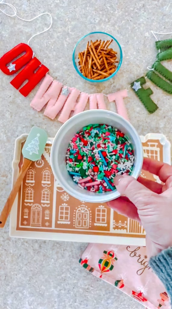 Quickly add sprinkles to the chocolate before it hardens. Repeat this process until all of the pretzels are covered.