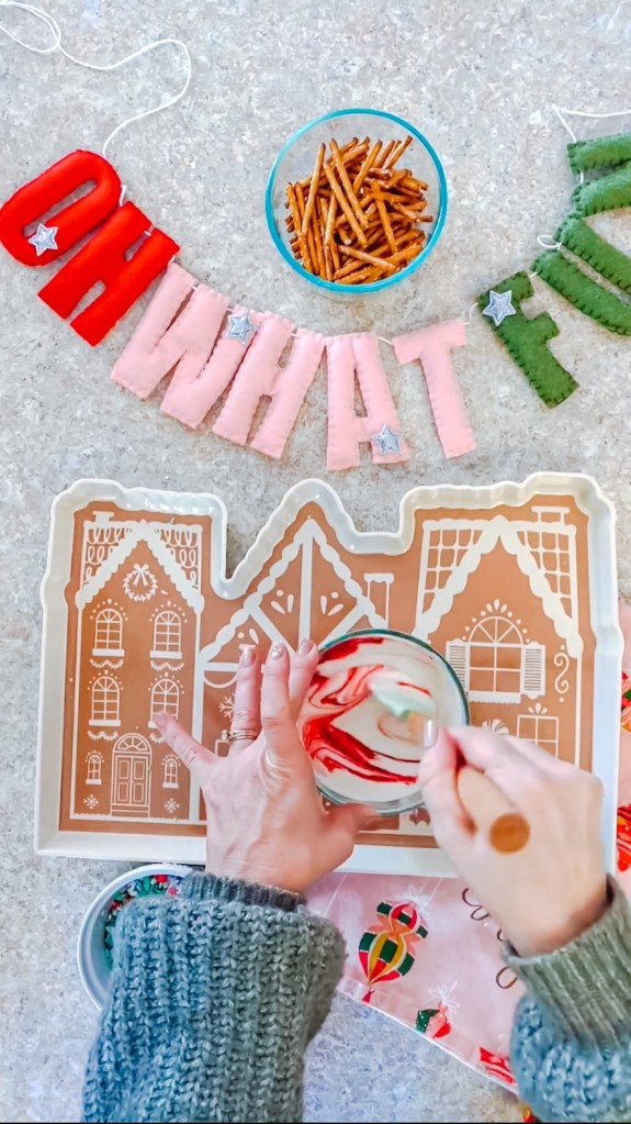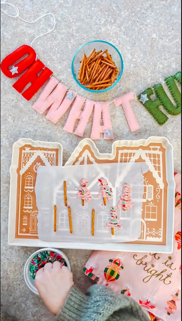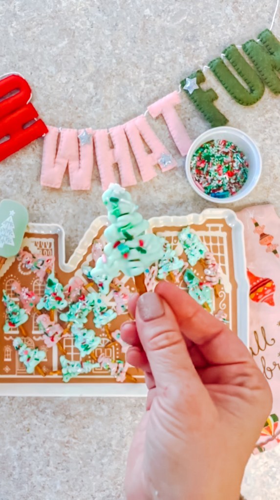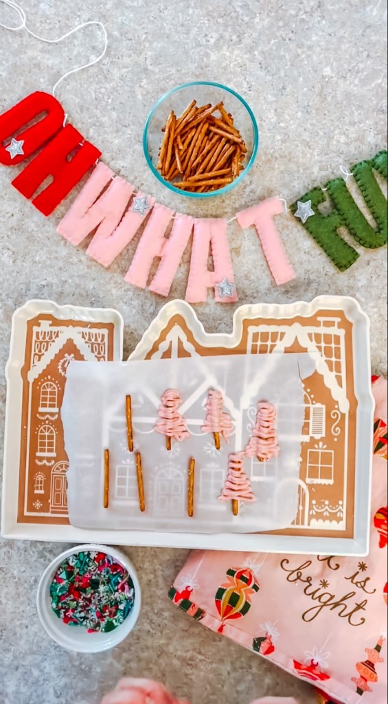 Squeeze chocolate onto a pretzel stick zig-zagging back and forth to create the shape of a tree. Be sure to leave a bit of pretzel uncovered at the bottom for the tree “trunk”.