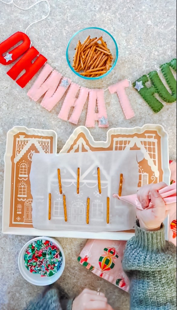 Lay a piece of parchment paper onto a tray. Gather pretzels & sprinkles.