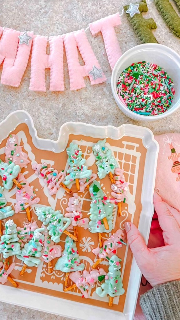 Are you looking for something that is NOT a cookie, but still a sweet treat this holiday season? These White Chocolate Pretzel Christmas Trees are extremely cute and are a great addition to a holiday cookie or dessert board. I made my trees pink and green but you could use any color of your choice. Red and green for a traditional Christmas, shades of blues and white for winter trees, etc.