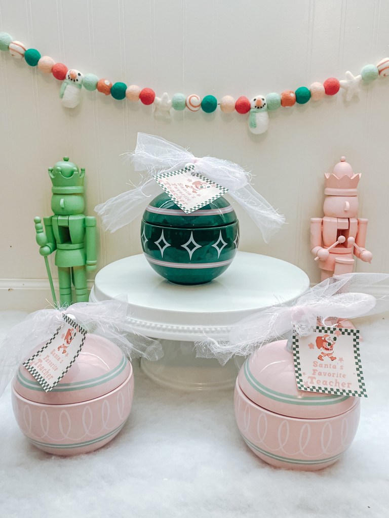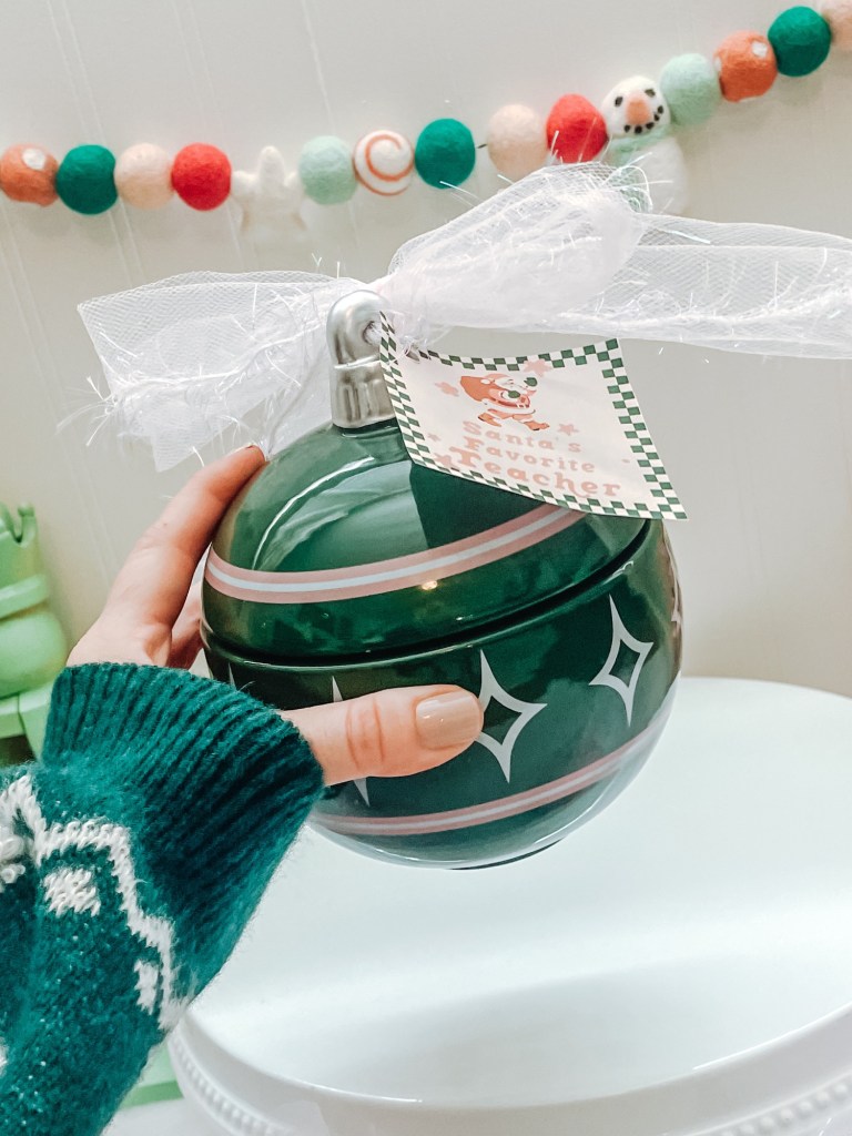 I am not kidding when I say I find the inspiration for my holiday teacher appreciation gift every year in the Target Dollar Spot and this year is no different. As soon as I saw these ceramic ornament containers (I really have no idea what it is called…a dish with lid? Who knows) I know I could stuff them full of goodies for the educators that have made such an impact on the lives of my children.
