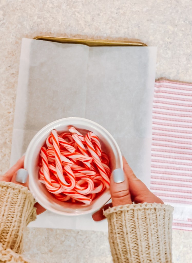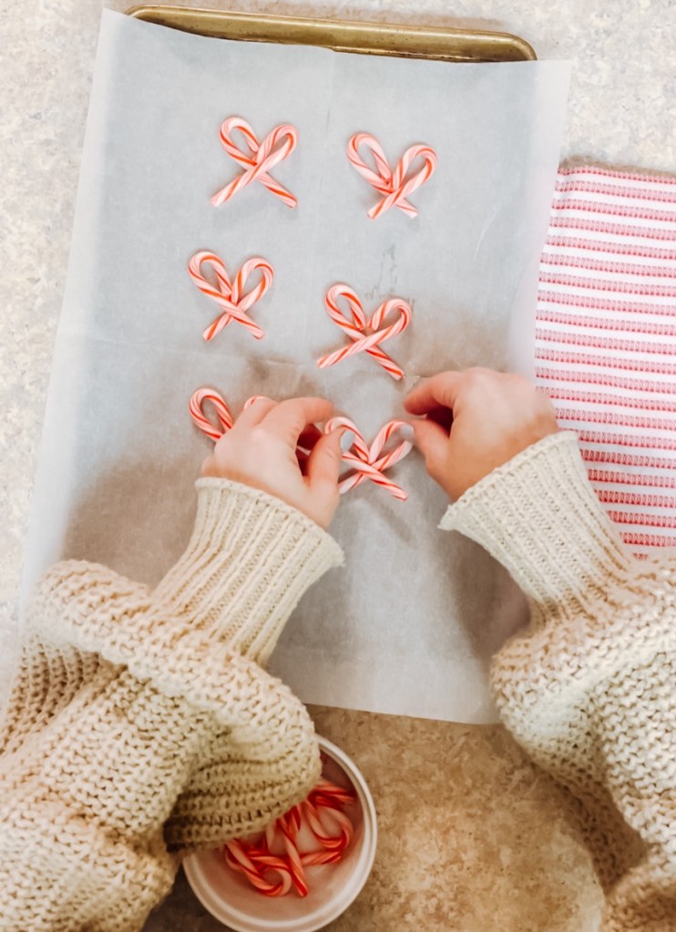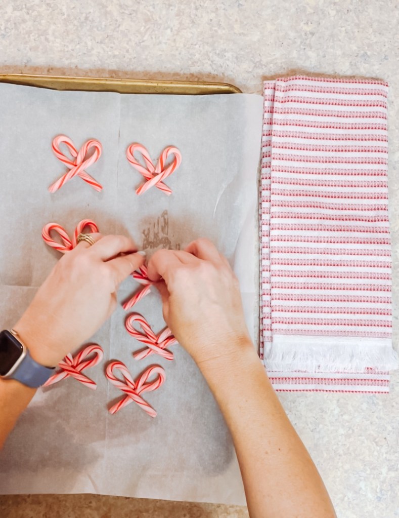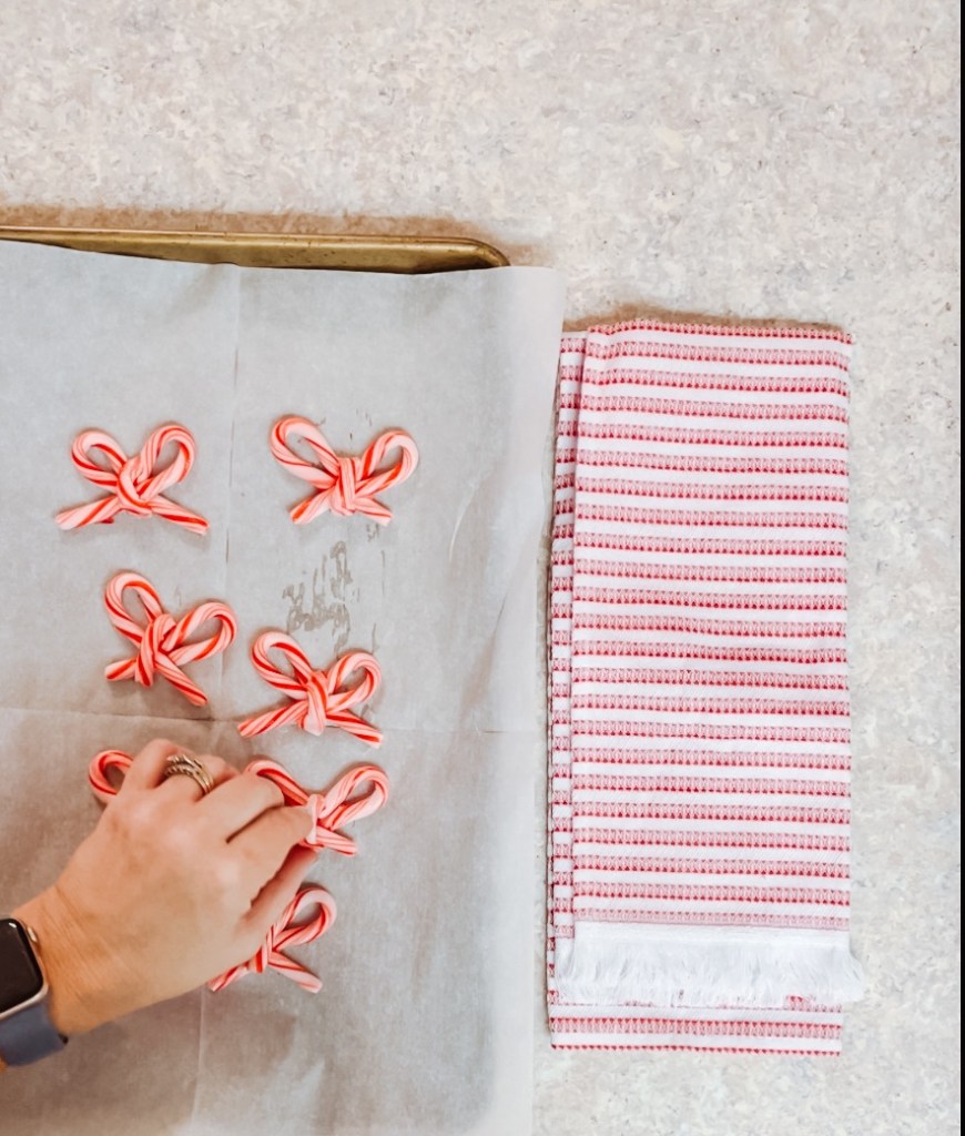 Next, add a small, curved piece of candy cane to the middle of the bow to look like a knot. Place back in the oven for 10 more minutes.