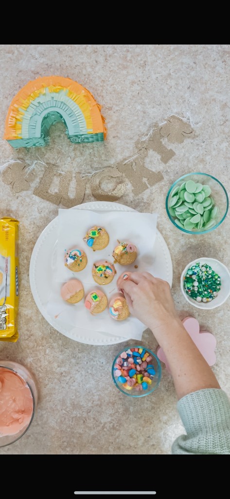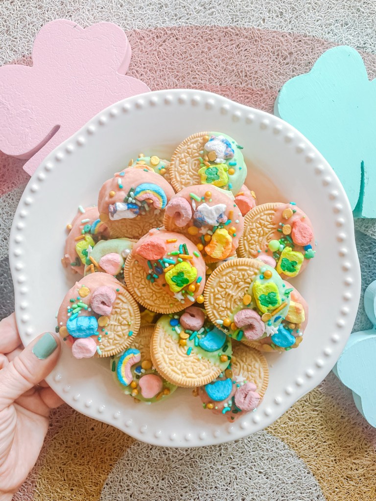 Contrary to popular opinion, I prefer Golden Oreos to traditional, chocolate Oreos. So, when St. Patrick’s Day comes around and gold coins are a staple, so to become Golden Oreos! In this rendition of chocolate dipped Oreos, I have used Lucky Charms cereal, pink and green melting chocolate (pink goes with every holiday, I promise), St. Patrick’s Day themed sprinkles and of course, Golden Oreos.