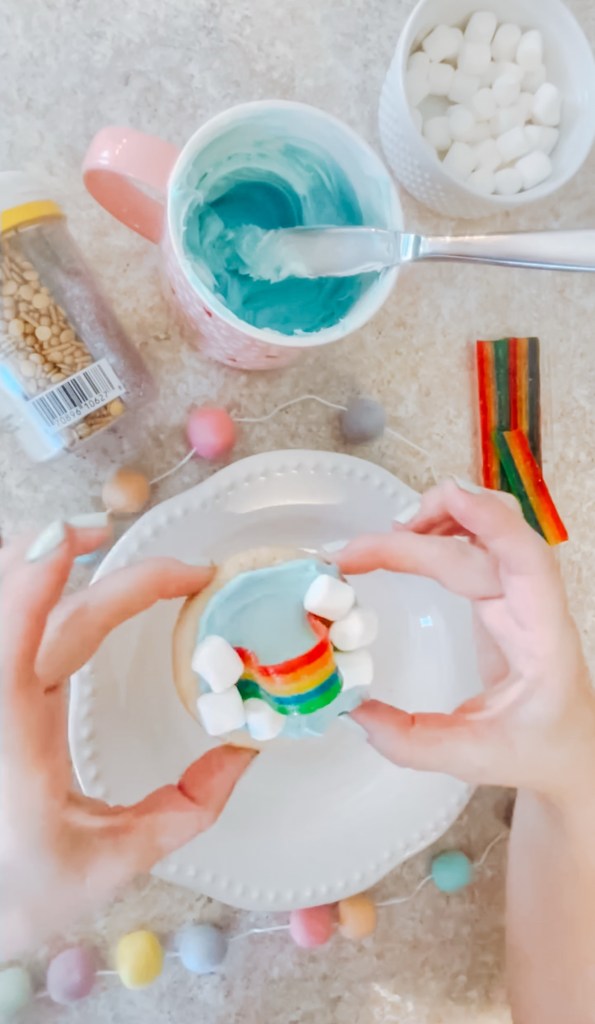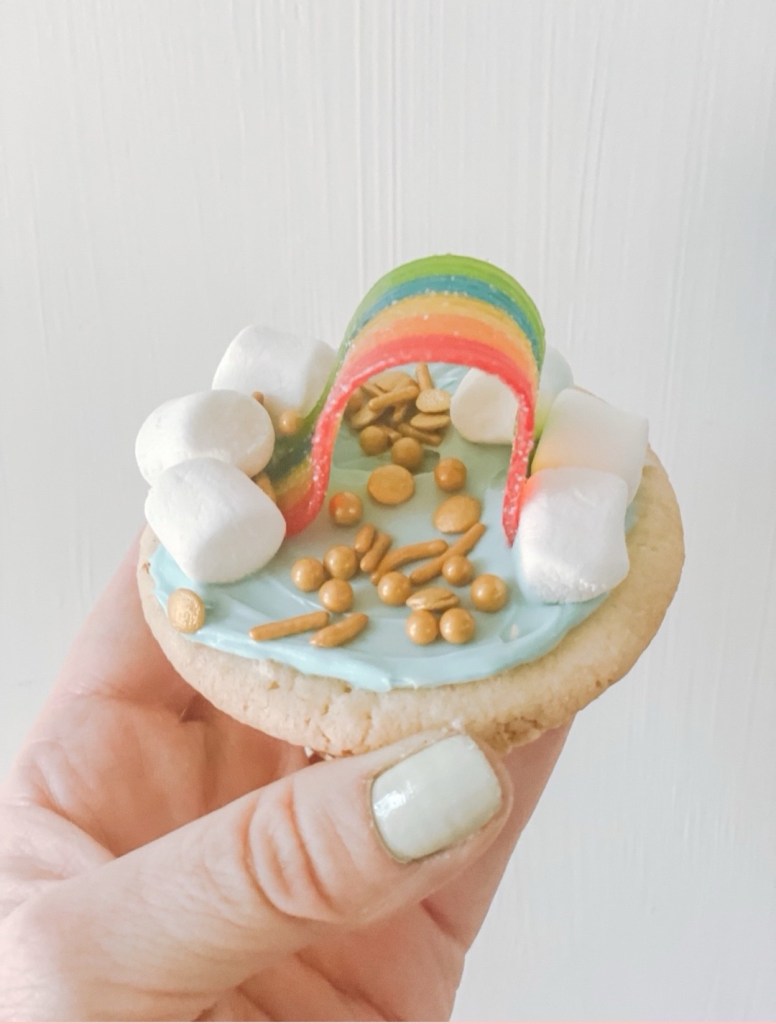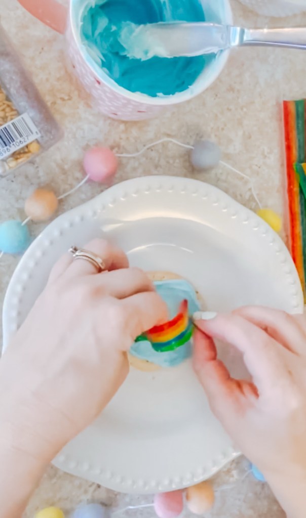 Cut a Rainbow Airehead in half. Fold it into an arch and secure each side to the cookie.