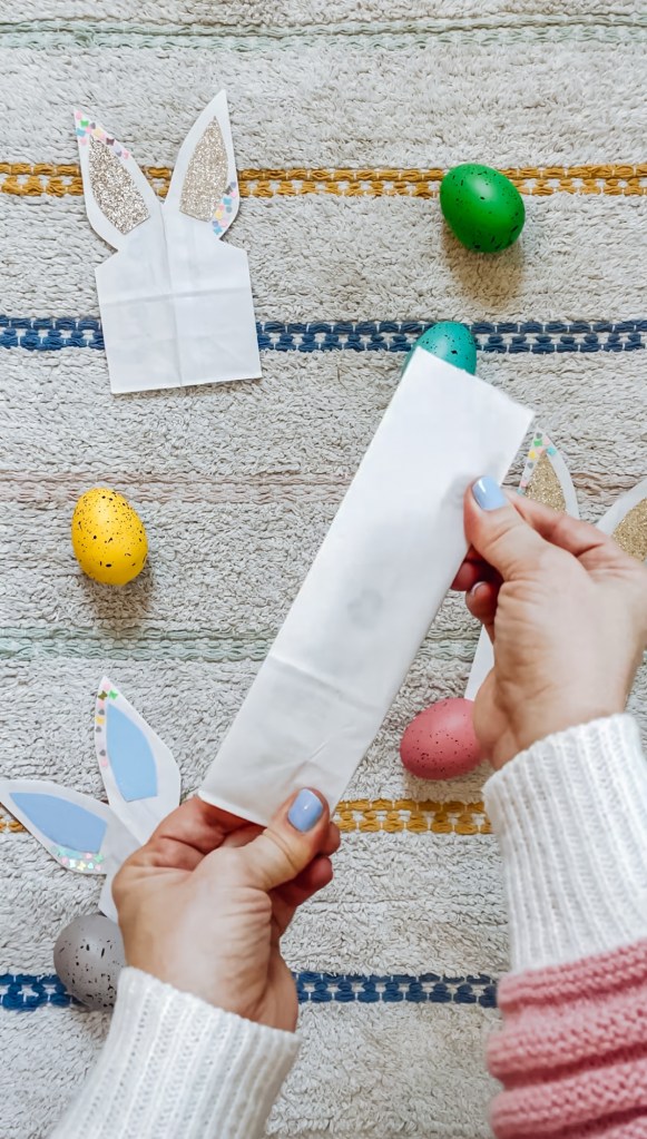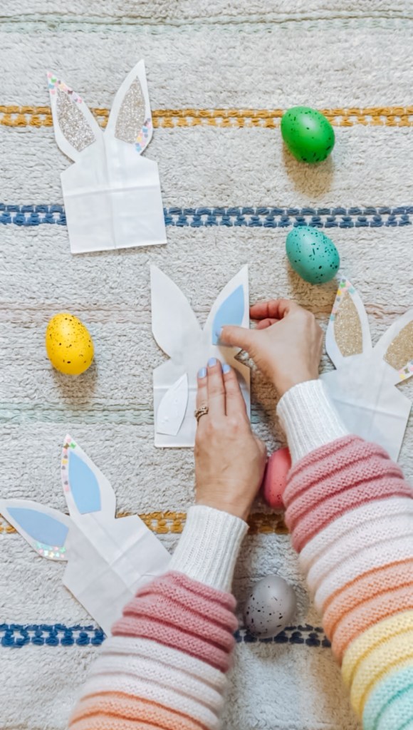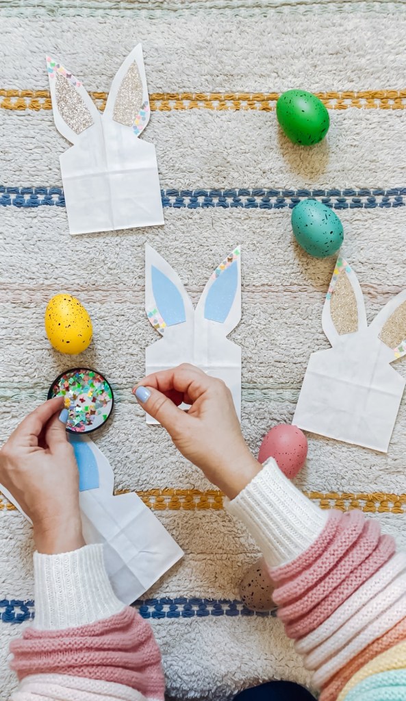 Once filled, tie ribbon or tulle around the middle to give the bag more of a bunny shape. Add an Easter tag if you want, too! My favorite tags are always from Thread Mama.