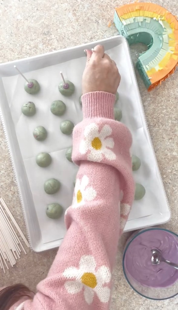 Dip the end of a lollipop stick into the chocolate and then insert the chocolate end into the balls. This will help keep the sticks in place.