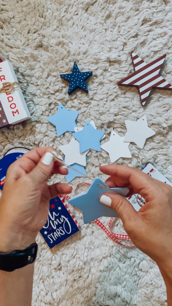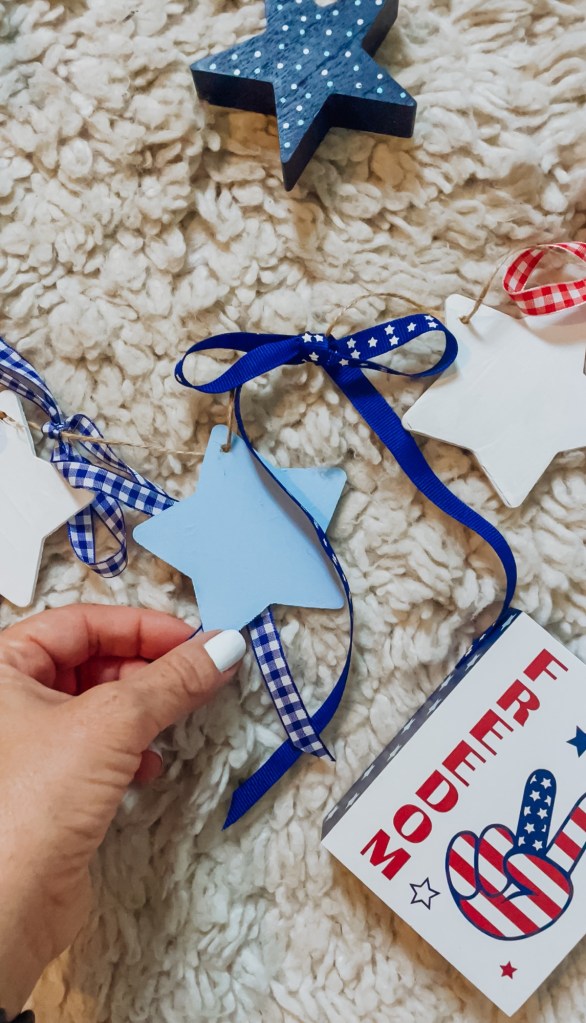 It’s been a minute since I’ve DIY’ed garland for my mantel. I’m ready to move away from all of my yarn pompoms and toward something a bit different – bows. Bows are very on trend and the patriotic ribbon selection at Hobby Lobby did not disappoint. As soon as I saw this red and blue gingham ribbon I new I had to have it. I tied it into the American flag with blue star ribbon and some painted wooden stars.