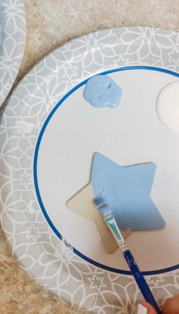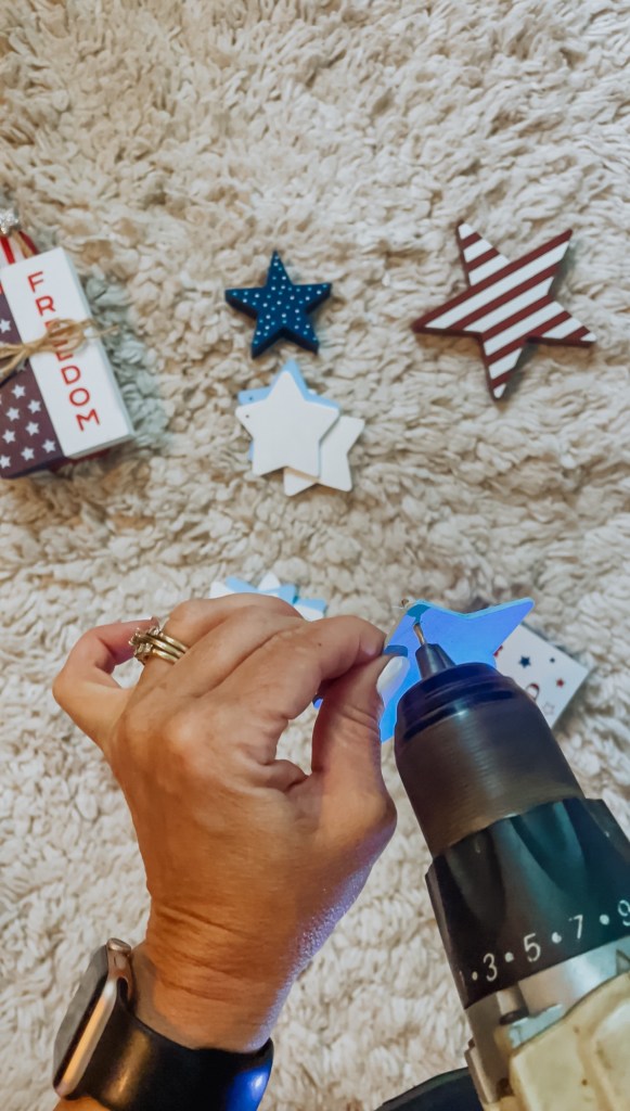 Once dry, use your drill and an appropriate sized bit (make sure it is large enough for stringing using your twine/string) to drill a hole in one of the points of each star.