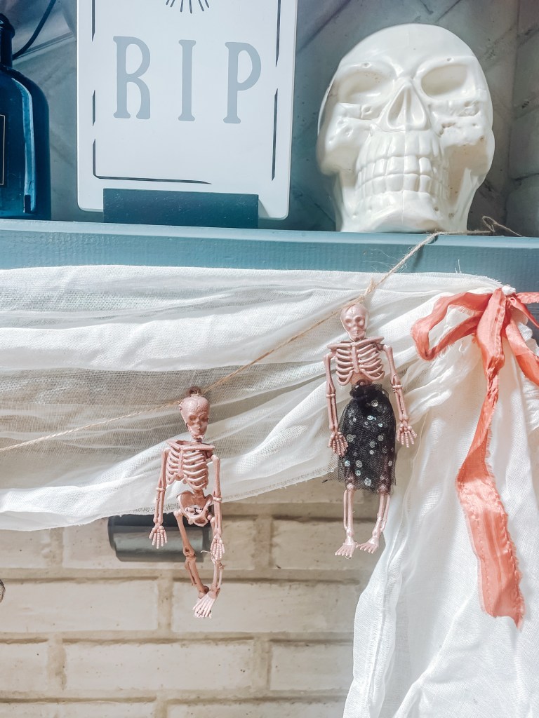 Once your garland is complete, hang it on your mantel, in a doorway, or across a wall. You’ll have a sparkly skeleton ballerina squad that’s perfect for Halloween parties or just to bring some festive fun into your home.