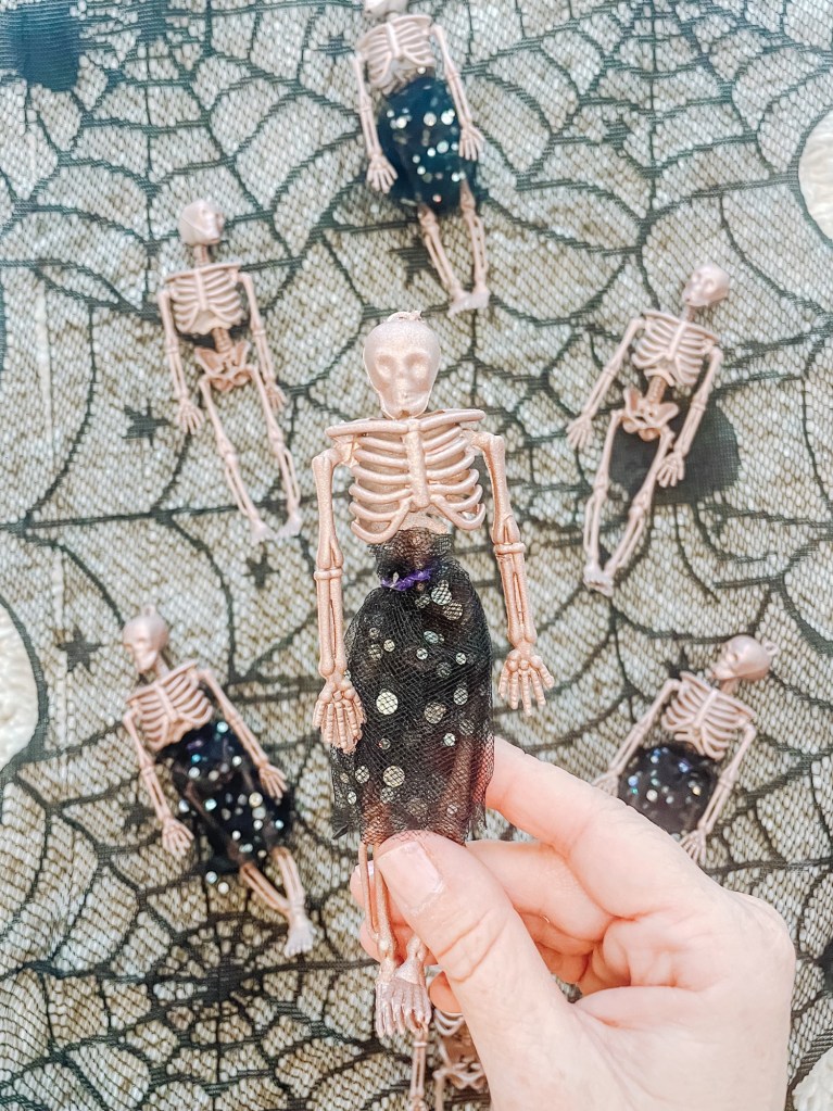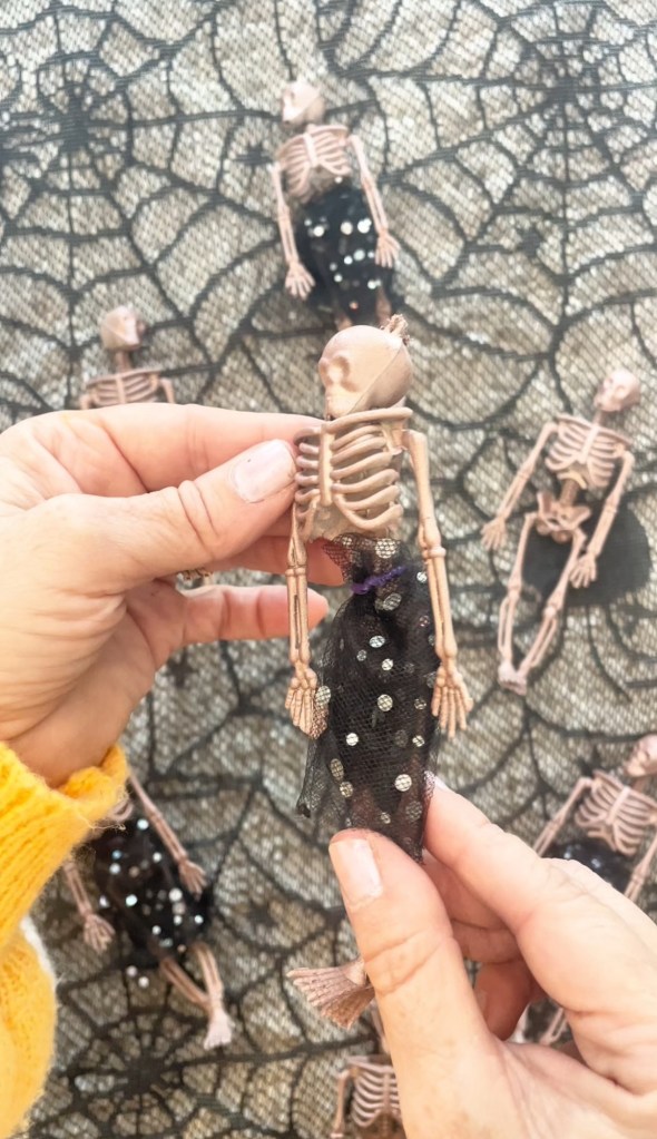 Cut strips of black glitter tulle about 6–8 inches long (depending on how full you want the tutus). Wrap the strips around each skeleton’s waist, layering them until you get a nice fluffy skirt.