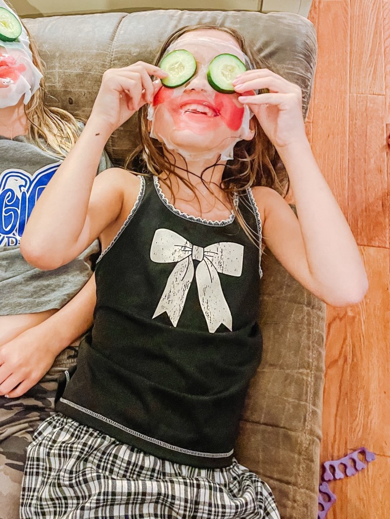 After some pampering, give the girls a chance to relax with a fun movie, popcorn, and cozy blankets. We chose Hocus Pocus because my house was already decked out in Halloween decor and they were feeling the spooky vibes. Some other great movie options include: