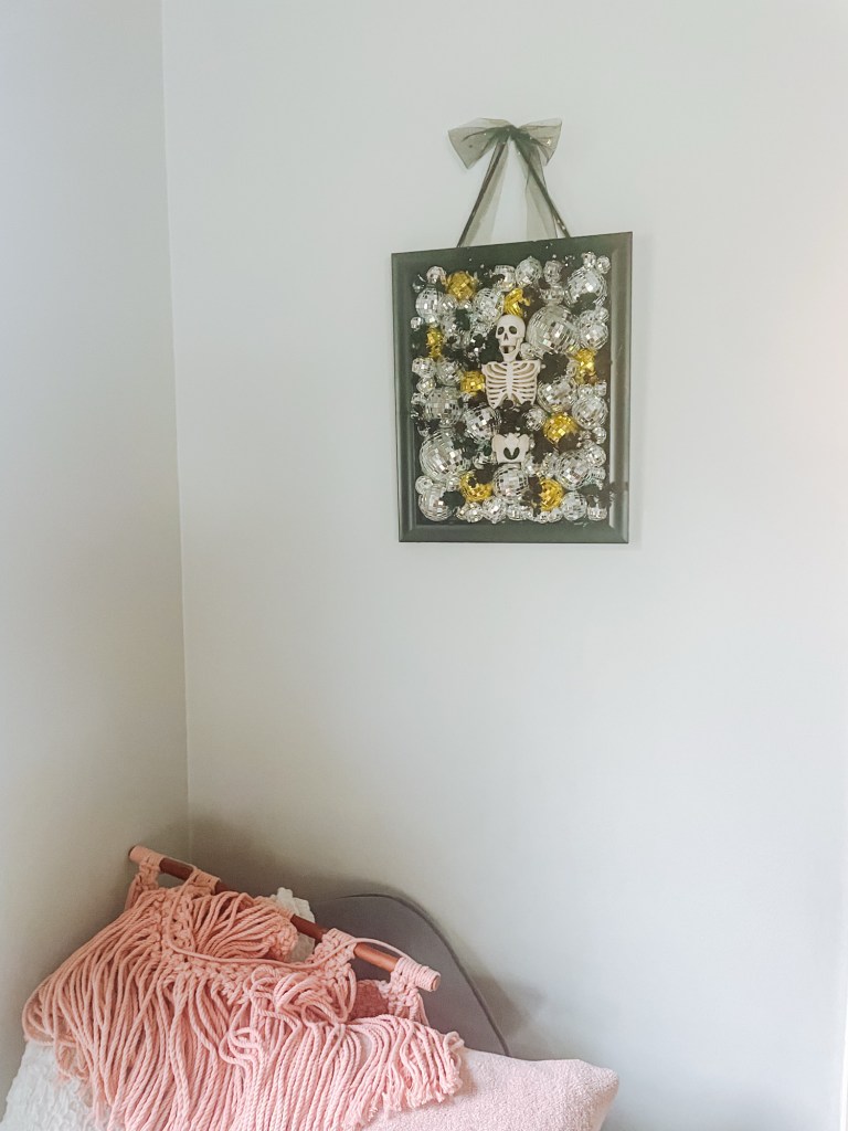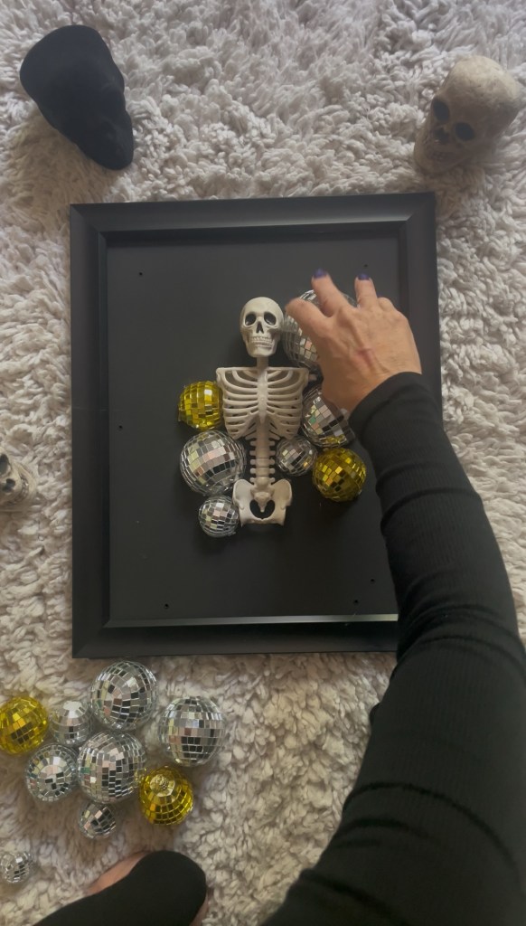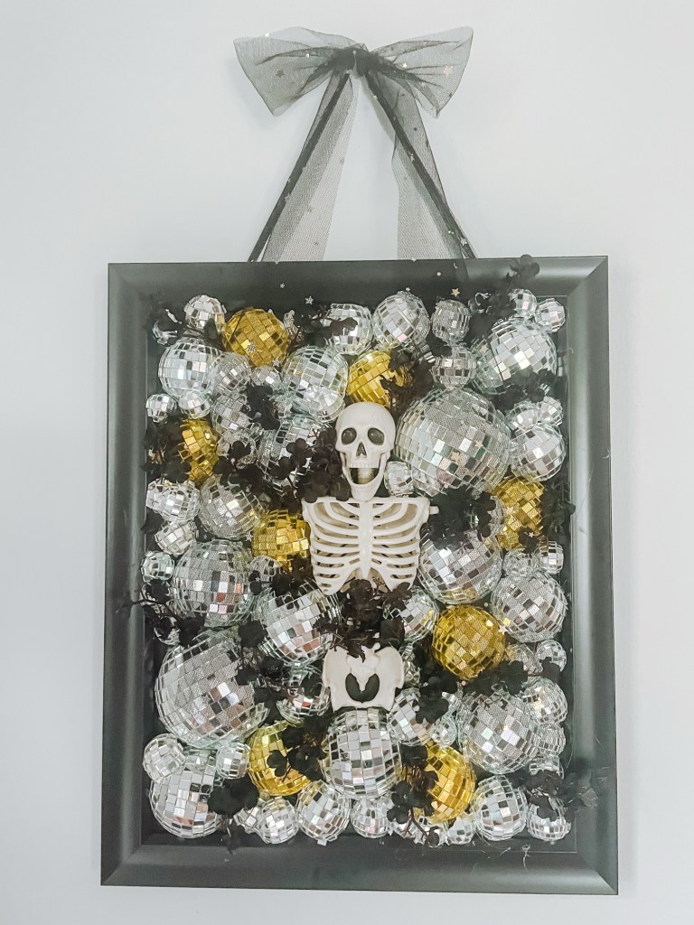 Use a serrated knife on a cutting board to carefully cut your disco ball ornaments in half. Hot glue the disco ball halves around the skeleton, filling in the frame evenly. Cover the entire background with disco balls, but leave the outer edges of the frame visible for a polished look.