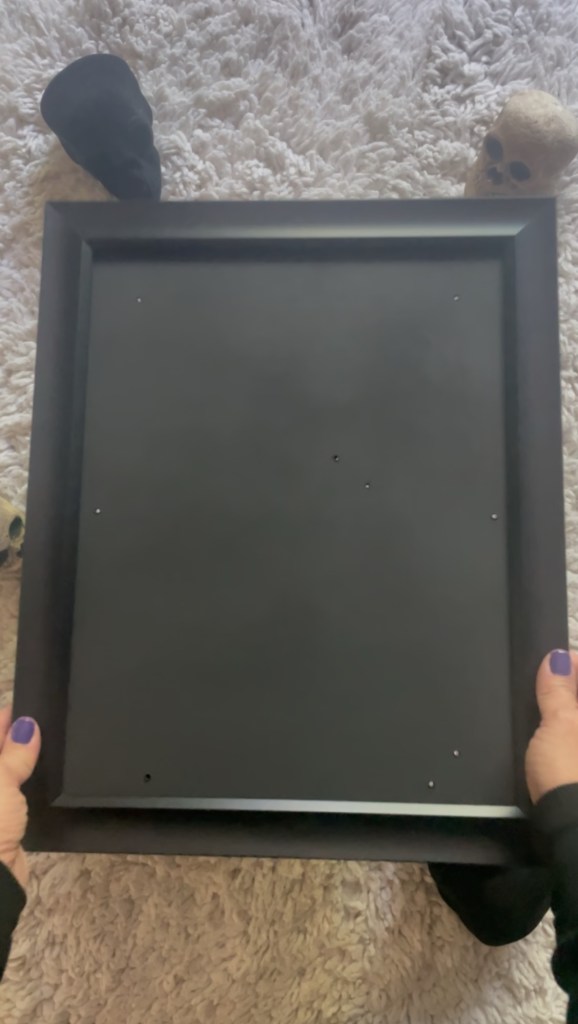 Remove the glass and backing from your photo frame. Spray paint the frame black for a sleek, spooky base. Let it dry completely.