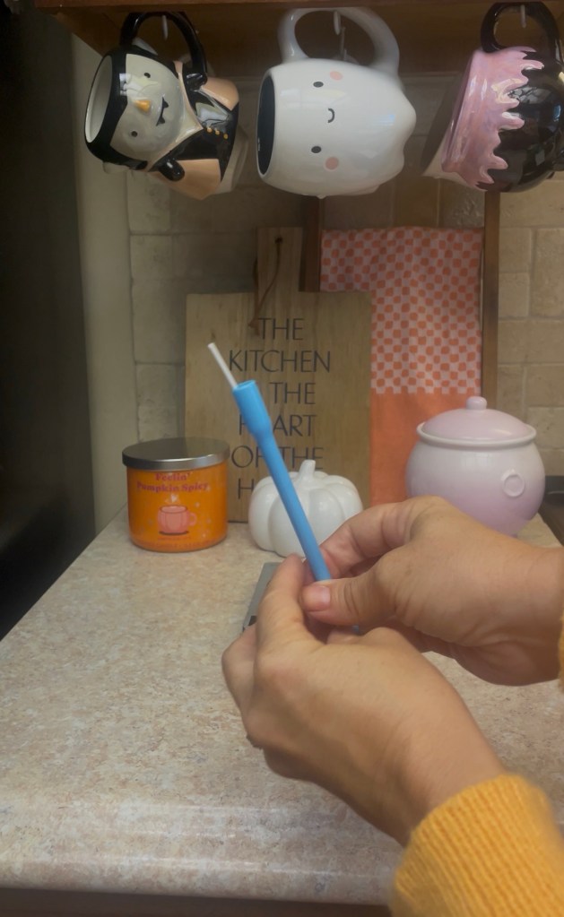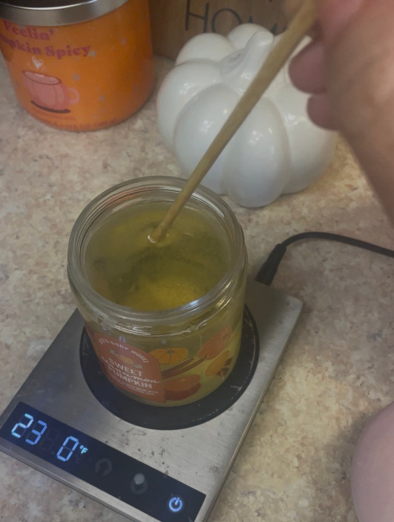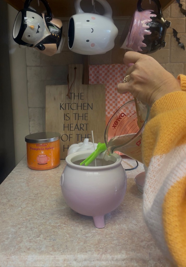 I used leftover pumpkin and vanilla candles (because that combo smells hauntingly good), a purple cauldron from the Target Dollar Spot (I found this last year), and a simple candle-making kit from Amazon. The best part? I melted everything down using my coffee warmer — no fancy tools needed!