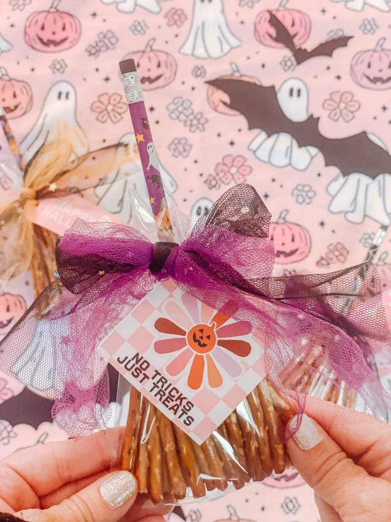 Add a festive tag: Tie on a Halloween gift tag to finish it off with a little extra charm.