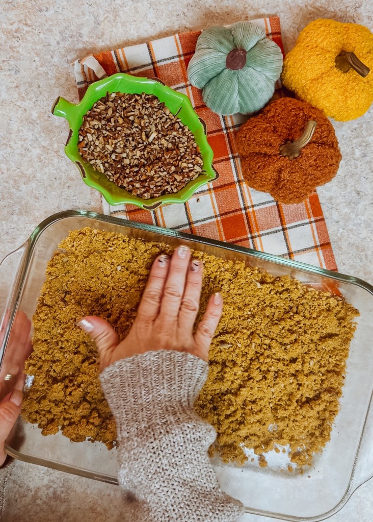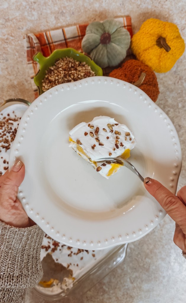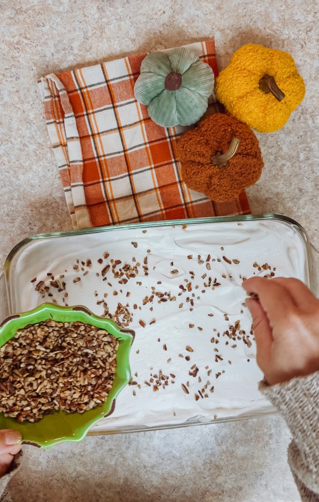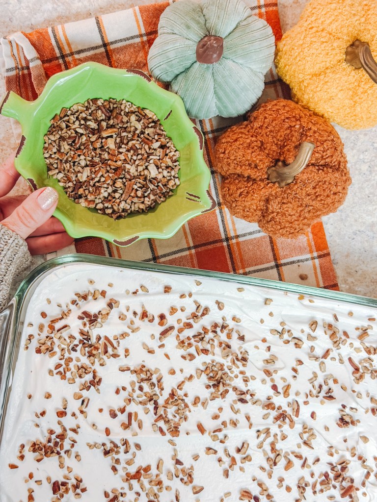 Imagine a base that’s buttery, slightly nutty, and just crisp enough to hold layers of creamy goodness. On top of that, a luscious cream cheese layer, then a fluffy pumpkin pudding layer, and finally a cloud of whipped topping crowned with pecans.
