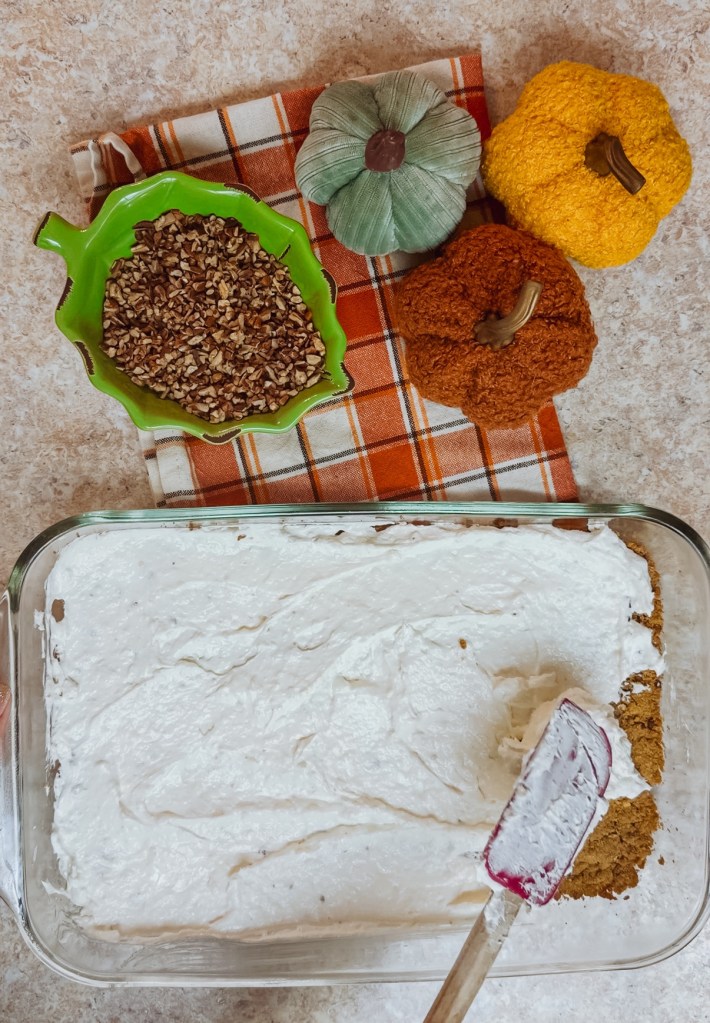 Spread the remaining 1 cup of whipped topping (or more, if you like a thicker top layer) over the pumpkin layer.
