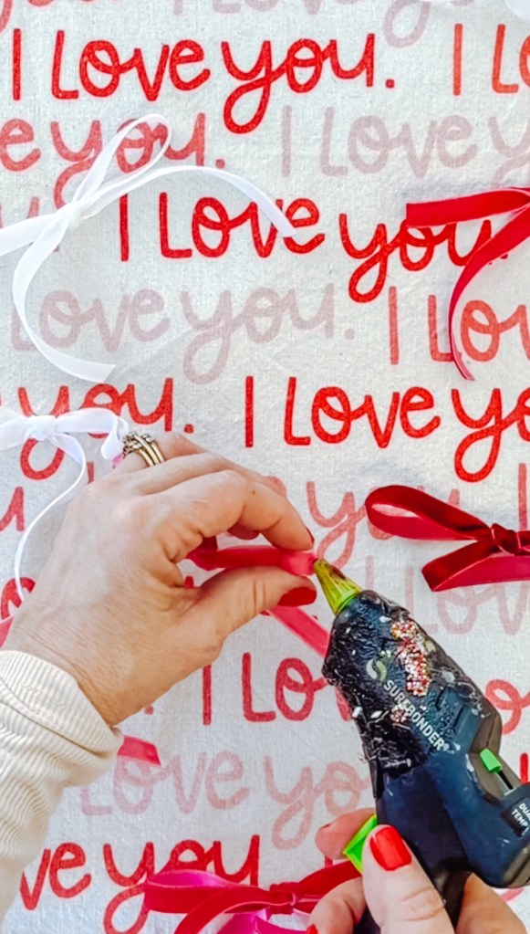 Once all your bows are made, use hot glue to attach them together end to end, forming a garland. Hold each connection for a few seconds to make sure it’s secure.