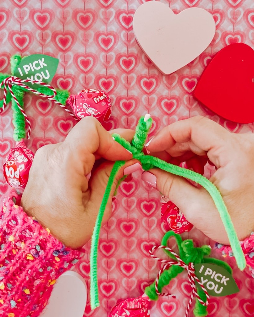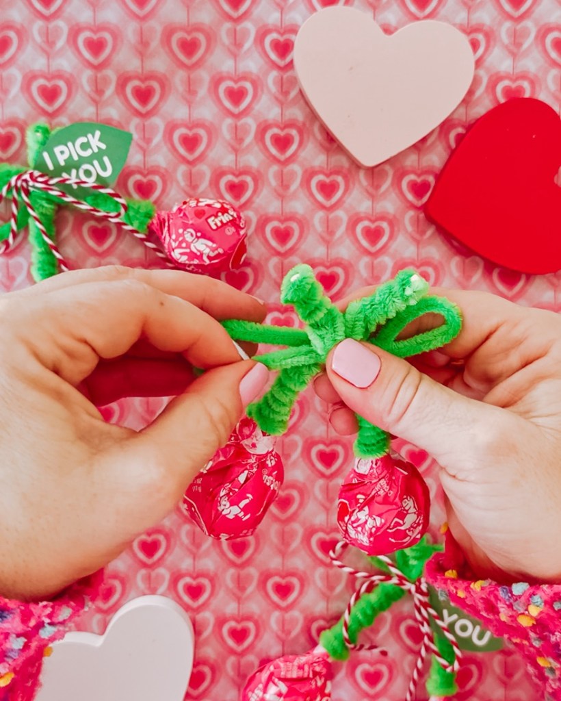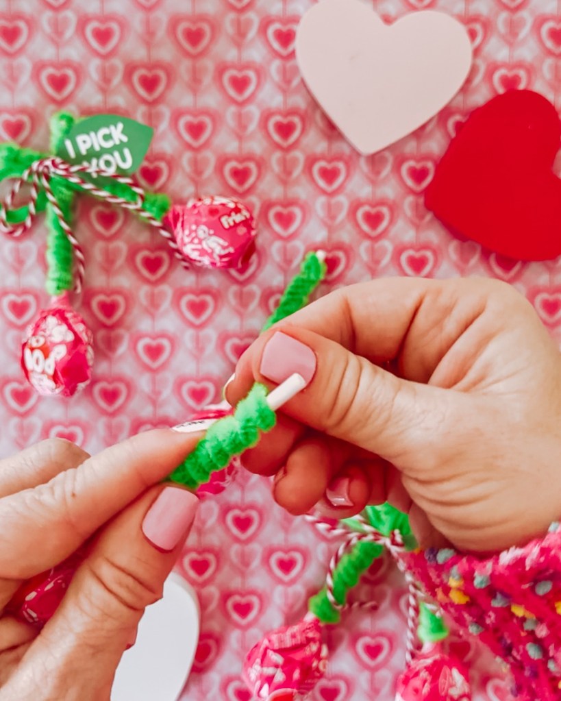 Use another green pipe cleaner to twist the two wrapped Tootsie Pop sticks together. This will form your cherry “stem.”